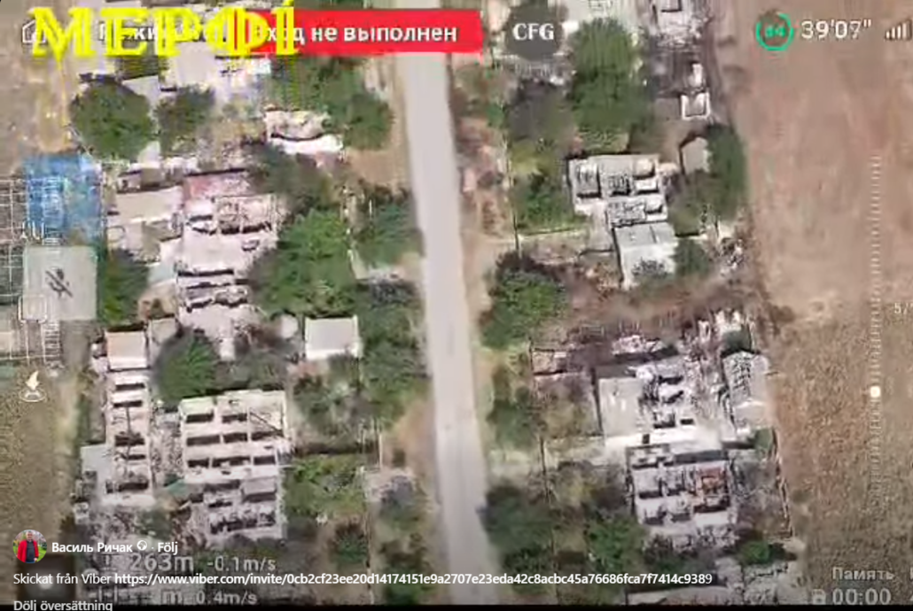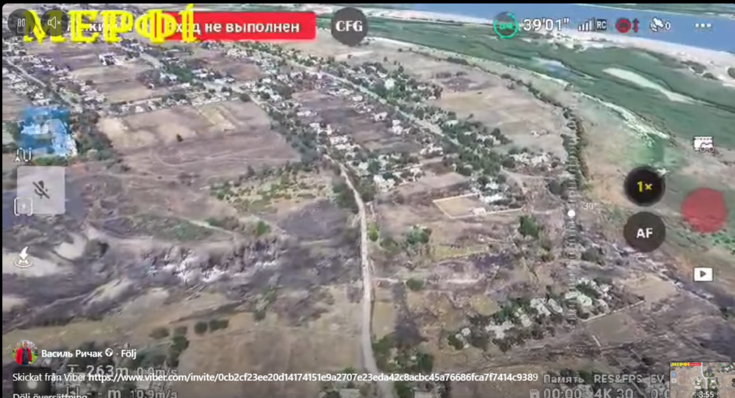 Nedre bilden Drönarbild över Gammalsvenskby 2025, från söder. Kyrktornet syns inte mer. Intressant att se hur floden Dnipro börjar se ut som innan dammen byggdes.